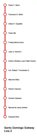Linia nr 2 przebiega ze wschodu na zachód, krzyżując się z Linią 1 przy Centro Olimpico Juan Pablo Duarte; składa się z 14 stacji o łącznej długości 12,85 km.