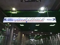 - tablice kierunkowe z nazwą stacji końcowej zawieszone nad peronem.