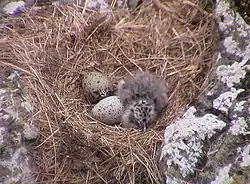 - Pisklęta po wykluciu pokryte są szarawym puchem z czarnymi plamkami na głowie. Ich karmieniem zajmują się oboje rodzice. Młode w pełni opierzone stają się po około 7 tygodniach od wyklucia[4].