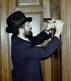 - ↑ Dovid Zaklikowski: Why Kiss the Mezuzah?. Chabad-Lubawicz Media Center. [dostęp 2015-03-14]. (ang.).