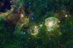 ![]() Mgławica Guma (czerwony pierścień) na tle Drogi Mlecznej, z Wielkim Obłokiem Magellana widocznym w prawym dolnym rogu. Najjaśniejsza gwiazda na zdjęciu to Kanopus. | |