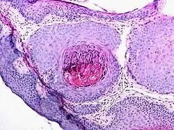 Zmiany histologiczne w zakażeniu MCV są bardzo charakterystyczne. Polegają na zrazikowatym przeroście naskórka połączonym z ogniskowym wnikaniem naskórka w głąb tkanki łącznej. W komórkach warstwy kolczystej naskórka obserwuje się liczne, początkowo kwasochłonne, później zasadochłonne cytoplazmatyczne wtręty, tzw. ciałka mięczakowate (molluscum bodies). Są to owalne, homogenne ciała o średnicy 15–35 μm; początkowo widoczne są w komórkach warstwy kolczystej naskórka, mogą jednak znaleźć się w keratynocytach każdej warstwy naskórka. W warstwie podstawnej naskórka można stwierdzić zwiększenie objętości keratynocytów, ich jądra również są powiększone. W warstwie kolczystej natomiast komórki posiadają jądra spłaszczone i zepchnięte na obwód. Zakażone komórki przesuwają się ku powierzchni i z warstwy rogowej "wysypują się" do światła krypt, utworzonych przez rozrastający się naskórek. Zmianom może towarzyszyć miernie nasilony odczyn zapalny. Komórki z ciałkami mięczakowatymi stwierdza się także w preparacie z wyciśniętych z guzka mas, wybarwionym metodą Giemsy.
