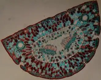 Miękisz asymilacyjny liści szpilkowych zbudowany jest z komórek o grubych ścianach tworzących wpuklenia do środka. Komórki tworzą warstwy prostopadłe do osi szpilki. Pomiędzy warstwami znajdują się przestwory międzykomórkowe. Są widoczne jedynie na przekroju podłużnym[1].