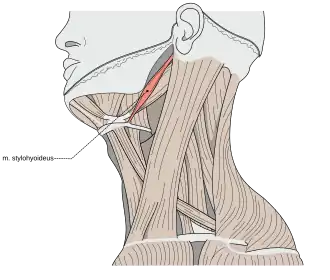 Rozpoczyna się na wyrostku rylcowatym kości skroniowej, kończy na kości gnykowej[2]. Towarzyszy brzuścowi tylnemu mięśnia dwubrzuścowego, biegnąc bardziej powierzchownie[1].