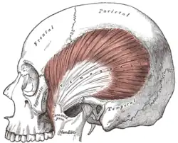 Mięsień skroniowy ciągnie się od dołu skroniowego czaszki, po wyrostek żuchwy[1].