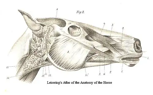 U konia punktem początkowym przyczepu są zarówno krawędzie jak i ścianki dołu, a punktem końcowym wyrostek dziobiasty i krawędź gałęzi żuchwy oraz powierzchnia przyśrodkowa tej kości, w miejscu styku z trzonem. Część włókien tego mięśnia wymienia się z mięśniem żwaczem[2].
