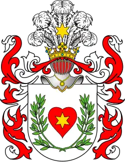 Klejnot: Na hełmie w koronie, złota gwiazda sześcioramienna na pięciu strusich piórach.