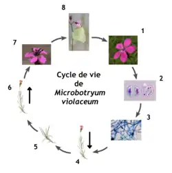 Microbotryum violaceum to grzyb mikroskopijny atakujący ponad 100 gatunków roślin z rodziny goździkowatych i kilka gatunków roślin z innych rodzin. Atakuje tylko ich kwiaty. W porażonych kwiatach zamiast pyłku wytwarzane są teliospory tego patogenu. Nie zabija on rośliny żywicielskiej a tylko powoduje jej sterylizację. Jeśli zarażone zostaną rośliny żeńskie dwupiennych żywicieli, patogen powoduje usunięcie ich znamion, a zamiast nich roślina wytwarza pylniki wypełnione zarodnikami grzyba. Są to teliospory przenoszone przez te same owady, które zapylają kwiaty. Kiedy diploidalne teliospory M. violaceum kiełkują, ulegają mejozie i dają początek czterem haploidalnym komórkom. Zwykle trzy komórki tworzą przedgrzybnię, która jest początkowo przyczepiona do teliospory zawierającej czwartą komórkę haploidalną. Każda komórka przedgrzybni może również pączkować tworząc haploidalne sporydia. Koniugacja jest warunkiem powstawania zakaźnych strzępek dikariotycznych, które atakują nowe rośliny, a zatem fuzja płciowa jest wymagane do przetrwania grzyba[4].
