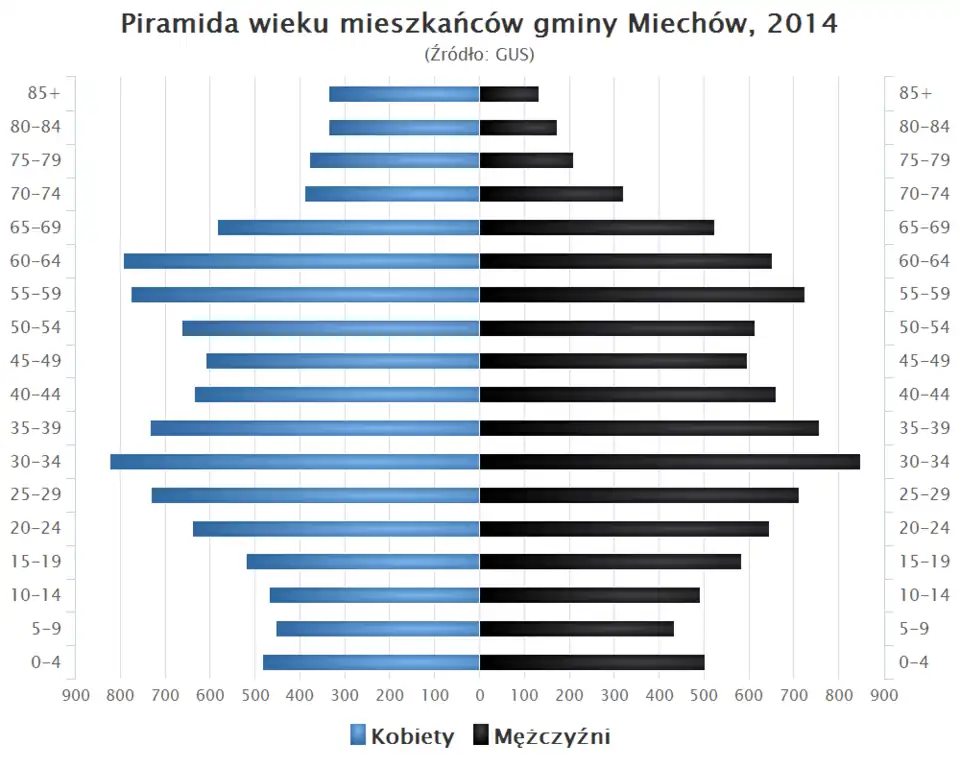 - Piramida wieku mieszkańców gminy Miechów w 2014 roku[1].