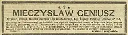 - Ś.p. Mieczysław Geniusz, „Kurier Warszawski” 1920, nr 337.