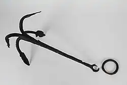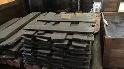 - Płaskowniki żelazne o szerokości 46–52 mm, grubości 10 mm i długości 75–93 cm były powiązane za pomocą żelaznej taśmy w wiązki o średniej masie 170 kg. Takich wiązek prawdopodobnie było 11. Mocno skorodowane, nie zostały jeszcze (2014) dokładnie zbadane i nie jest znane ich przeznaczenie[31].