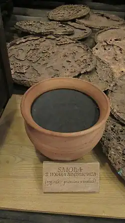 - Smoła drzewna była transportowana w szczelnych beczkach o pojemności 69 do 90 litrów z dębiny opasanej leszczynowymi obejmami. Znaleziono 15 takich beczek, prawdopodobnie wykonanych w Gdańsku[36].