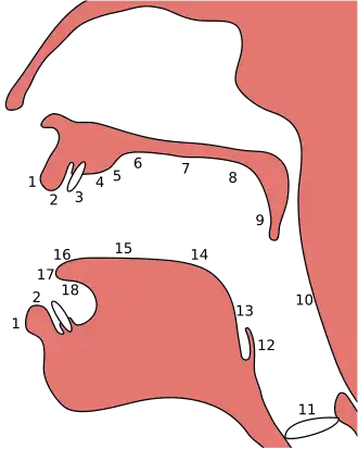 11. struny głosowe, 12. nagłośnia, 13. korzeń języka, 14. tył języka, 15. środek języka, 16., 17., 18. przód języka (dokładniej 16. artykualcja laminalna, 17. apikalna, 18. subapikalna), 1. zewnętrzna część dolnej wargi, 2. wewnętrzna część dolnej wargi