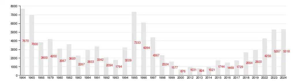 Frekwencja10 tysięcy kibiców było na trybunach 5 października 1958 r. podczas pierwszego meczu barażowego o awans do II ligi. Raków wygrał wówczas 1ː0 z BBTS Bielsko-Biała[32]. Około 10 tysięcy widzów odnotowano 29 czerwca 2005 podczas barażowego meczu o awans do III ligi, który Raków wygrał z Koszarawą Żywiec po rzutach karnych (0-0 pd. k. 9-8)[9][33]. Pełny stadion (8500 widzów) zgromadził także 1 września 2011 wygrany 1ː0 towarzyski mecz z ówczesnym mistrzem Polski Wisłą Kraków, rozegrany z okazji 90-lecia istnienia klubu Raków Częstochowa[34][35]. Największą średnią frekwencję na meczach Rakowa w I lidze odnotowano w sezonie 1994/1995 (3. miejsce wśród klubów ligi)[36] oraz w sezonie 1995/1996 (4. miejsce)[36].
