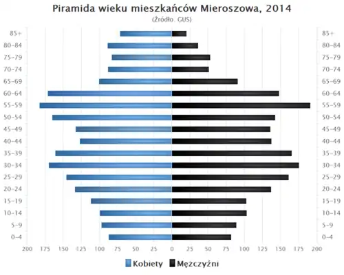 Piramida wieku mieszkańców Mieroszowa w 2014 roku[9].