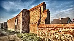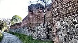 - Mury obronne z XIII–XIV w. zbudowane z głazów narzutowych, w górnej części z cegły (w XV w.); obecna długość 1,5 km, średnia wysokość 5–7 m. Zachowało się 14 czatowni łupinowych i 12 prostokątnych (w tym Baszta Prochowa z XV w.). Przeważająca część murów i fortyfikacji jest zdewastowana. Wzdłuż murów prowadzi promenada.
