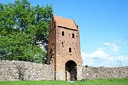 - Wczesnogotycki kościół pw. Przemienienia Pańskiego – wzniesiony pod koniec XIII w. (pierwsza wzmianka z 1297 r.[48]) jako budowla salowa, z ciosów granitowych, bez chóru, z wieżą od strony zachodniej o szerokości nawy. Przebudowany został w 1 poł. XIV w. do postaci gotyckiej ceglanej budowli dwunawowej, z nawą północną niższą od nawy głównej i prosto zamkniętym, jednoprzęsłowym prezbiterium. Prawdopodobnie wówczas podniesiono również wieżę, ponownie także w XV/XVI[49]. Na wieży znajduje się tzw. dzwon herbowy z 1756 r. W XVIII w. powstałą zachowana do dziś barokowa forma zwieńczenia wieży. Częściowe zmiany zaszły w wyniku prac remontowo-konserwatorskich w latach 1849 oraz 1882-1909. Uwagę zwraca granitowy portal wejściowy. Wyposażenie wnętrza stanowią m.in. średniowieczna chrzcielnica (prawdopodobnie z XIV w.) z wapienia gotlandzkiego, obecnie znajdująca się po lewej stronie prezbiterium oraz dwie drewniane figurki ewangelistów z początku XVII w.