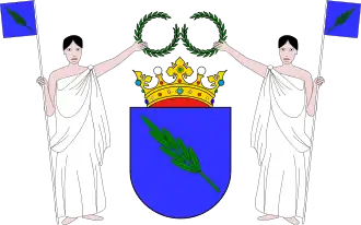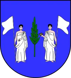 2. W polu błękitnym dwie nieokreślone muzy w pas, każda trzyma sztandar ze swoim (nieokreślonym) znakiem, zaś lewa dodatkowo trzyma koronę. Między nimi gałąź oliwna zielona[3].