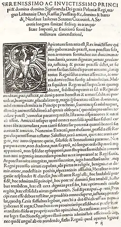 - Juris provincialis quod Speculum Saxonum vulgo nuncupatus libri tres opera vigilanti in correctiorem redacti materiam, adjuncti simul glossis aliisque additionibus noviter reccollectis pro interpraelatione textus magis neccessariis Annotatainsuper in marginibus habentur loca legum Jurisque municipalis Magdeburg, materiam textus et glossarum approbantia declarantiaque grato lectori magnum afferentia commodum in Reg a Polonie (Zwierciadło saskie), dzieło dedykował Zygmuntowi Staremu;