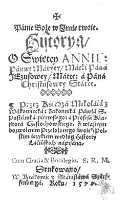 - ↑ Historya o swiętey Annie, Panny Maryey matki Pana Jezusowey matce, a Pana Christusowey starce przez księdza Mikolaia z Wilkowiecka [...] polskim ięzykiem według historiy lacińskich napisana. (Kraków, 1577) [online], polona.pl [dostęp 2018-03-06].