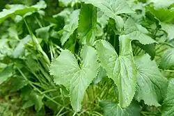 - Odziomkowe są długoogonkowe i niepodzielone, o blaszce sercowato trójkątnej, na brzegu nierówno ząbkowano piłkowane, z ząbkami kolczastymi. Liście łodygowe są mniejsze, krótkoogonkowe i w górnej części pędu siedzące i dłoniasto wcinane, na brzegach z ząbkami wybiegającymi w długie ząbki[8].