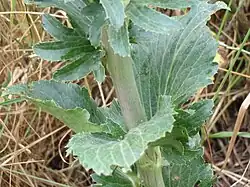 - Roślina zielna o pędzie podziemnym w postaci zgrubiałego, pionowego kłącza, z którego wyrastają prosto wzniesione łodygi górą rozgałęziające się i tu zwykle niebiesko nabiegłe[6]. Osiąga wysokość przeważnie 30–60 cm (rzadziej do 100 cm)[5].