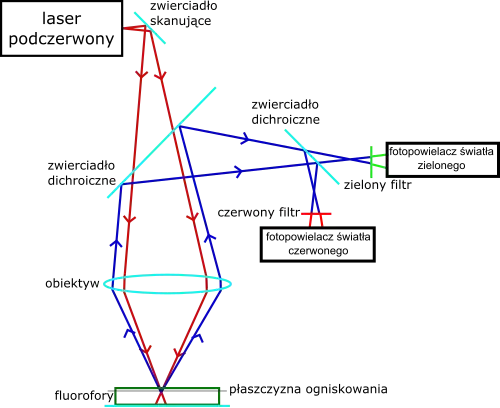 Prawdopodobieństwo wzbudzenia fluoroforu przez dwa różne fotony jest niskie i zależne od kwadratu natężenia wiązki wzbudzającej. Jednak zapewnia to, że wzbudzenie nastąpi tylko w punkcie ogniskowania wiązek. Za pomocą zwierciadła skanującego można przesuwać punkt ogniskowania po płaszczyźnie ogniskowania i w ten sposób skanować daną płaszczyznę próbki. Przesuwając punkt ogniskowania w górę i w dół, możemy także skanować trzeci wymiar. Dużą zaletą systemu dwufotonowego jest to, że używane do wzbudzania światło podczerwone nie ulega rozpraszaniu tak silnie jak krótsze fale, co podnosi rozdzielczość obrazowania. Ponadto ma ono lepszą zdolność do penetracji próbki (z drugiej strony fale dłuższe niż 1400 nm są z kolei bardzo silnie pochłaniane przez wodę obecną w preparatach). Dłuższa fala niesie także mniej energii, co obniża możliwe uszkodzenia powodowane przez światło poza płaszczyzną ogniskowania, przy przechodzeniu przez próbkę (fototoksyczność). Wadami systemu jest ich wysoka cena, na którą wpływa konieczność stosowania drogiego lasera podczerwonego i dostosowanej do niego optyki. Także widma absorpcji fluoroforów w systemie dwufotonowym różnią się od tych w systemie jednofotonowym, co często pociąga za sobą konieczność stosowania niestandardowych rozwiązań w tej kwestii.