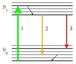 gdzie D oznacza maksymalną rozdzielczość, λ długość fali świetlnej, a NA aperturę numeryczną. Ponieważ w technice STED fluorescencja jest dezaktywowana selektywnie, osiągana rozdzielczość przekracza limit Abbego charakterystyczny dla tradycyjnej mikroskopii konfokalnej. Typowa fluorescencja występuje po wzbudzeniu elektronu z poziomu podstawowego do elektronowego poziomu wzbudzonego następnego poziomu energetycznego który następnie poprzez relaksację do poziomu podstawowego emituje foton o energii stanowiącej różnicę energii poziomów i W technice STED proces ten zostaje przerwany zanim foton zostanie wyemitowany. Zamiast spontanicznej relaksacji do niskoenergetycznego poziomu wibracyjnego na poziomie podstawowym elektron jest zmuszony do relaksacji na wyżej energetyczny poziom wibracyjny poziomu podstawowego i emisji fotonu niżej energetycznego, jak zostało pokazane na rysunku obok.[6] Ponieważ elektron relaksuje na wyższy poziom wibracyjny, energia pomiędzy stanem wzbudzonym a stanem po wymuszonej emisji jest mniejsza niż dla emisji spontanicznej. Tym samym długość fali wyemitowanego na sposób wymuszony fotonu jest większa, więc bardziej przesunięta w stronę czerwieni. Przesunięcie emisji w stronę dłuższych fal pozwala na zignorowanie fotonu wymuszonego.
