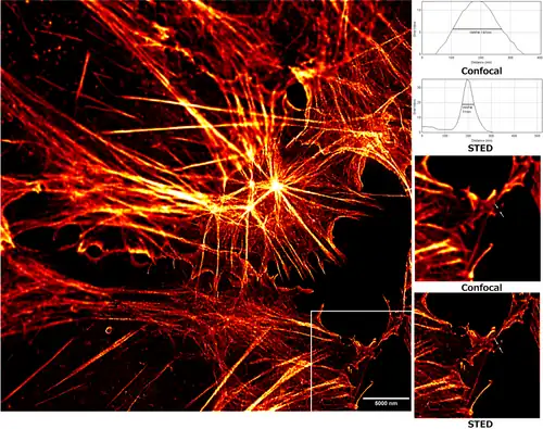 Od początku STED pozwalało na wykonywanie optycznego obrazowania z dokładnością dostępną wyłącznie dla mikroskopii elektronowej. Jako przykład może posłużyć fakt, że STED zostało wykorzystane do wykonania analizy strukturalnej protein na poziomie wewnątrzkomórkowym, czego dowodem jest obserwacja filamentów cytoszkieletu. Dodatkowo neurofilamenty, aktyna i tubulina są stosowane do porównywania mocy rozdzielczej mikroskopów STED i konfokalnego[13][14][15].