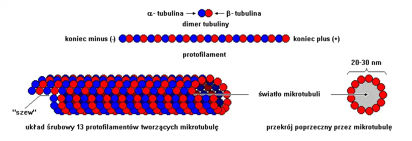 Całość tworzy długą cylindryczną strukturę zbudowaną z 13 równoległych protofilamentów. Każdy protofilament będący linearnym łańcuchem dimerów tubuliny ułożonych na przemian wzdłuż całego łańcucha ma strukturalną biegunowość wynikającą z naprzemiennego ułożenia α i β-tubuliny z czego na jednym końcu eksponowana jest α-tubulina a na drugim β-tubulina.
