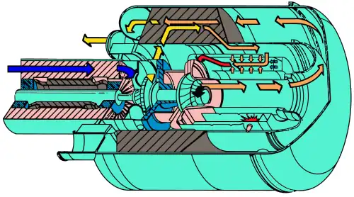 - kolor czerwony – gorące spaliny z komory spalania przechodzą do turbiny,