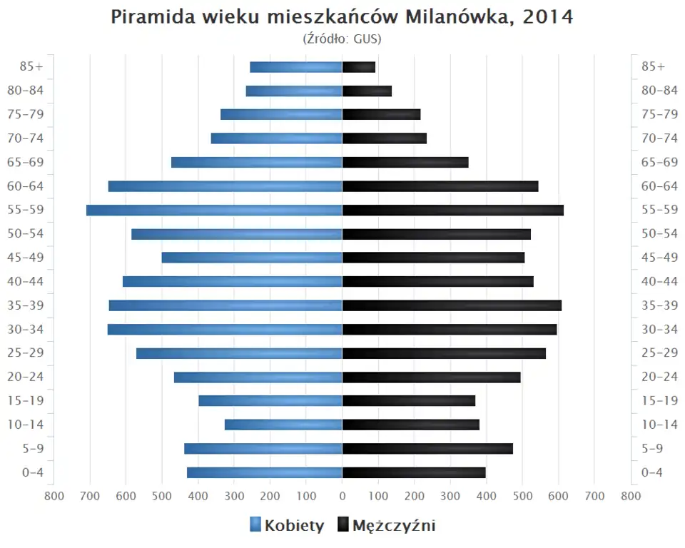 - Piramida wieku mieszkańców Milanówka w 2014 roku[2].