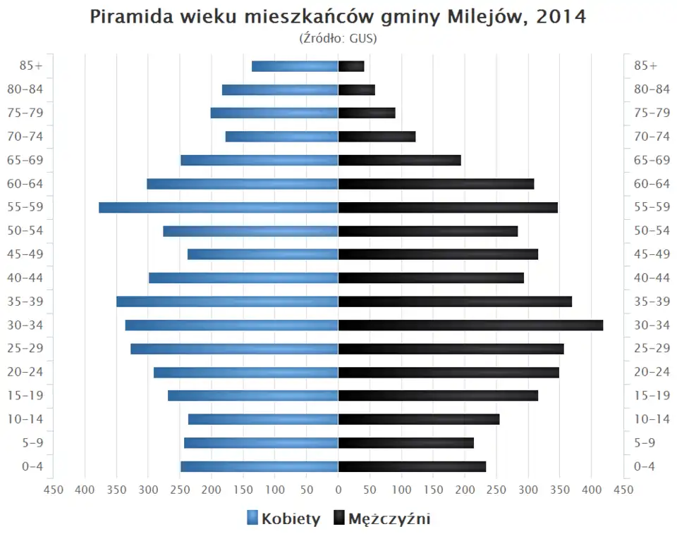 - Piramida wieku mieszkańców gminy Milejów w 2014 roku[1].