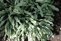 - Dojrzałe liście odziomkowe są nieco szorstkie, mierzą 20–55 cm długości i 2,5–5,5 cm szerokości, pokryte są białymi lub bladozielonymi plamkami na górnej powierzchni, mają wąsko lancetowaty kształt, z nasadą powoli zbiegającą po ogonku i spiczastym wierzchołkiem[4][6][7][8]. Blaszka liściowa jest 6–9 razy dłuższa niż szeroka, po obu stronach mniej lub bardziej pokryta gruczołami. Ogonek liściowy jest skrzydlaty, krótszy niż blaszka. Liści łodygowych jest 7–9, są siedzące (nasadą w połowie obejmujące łodygę), mają jajowato lancetowaty kształt ze spiczastym wierzchołkiem, mierzą 5,3–6,7 (maksymalnie 8,1) cm długości i 2,1 cm szerokości[4][6][7].