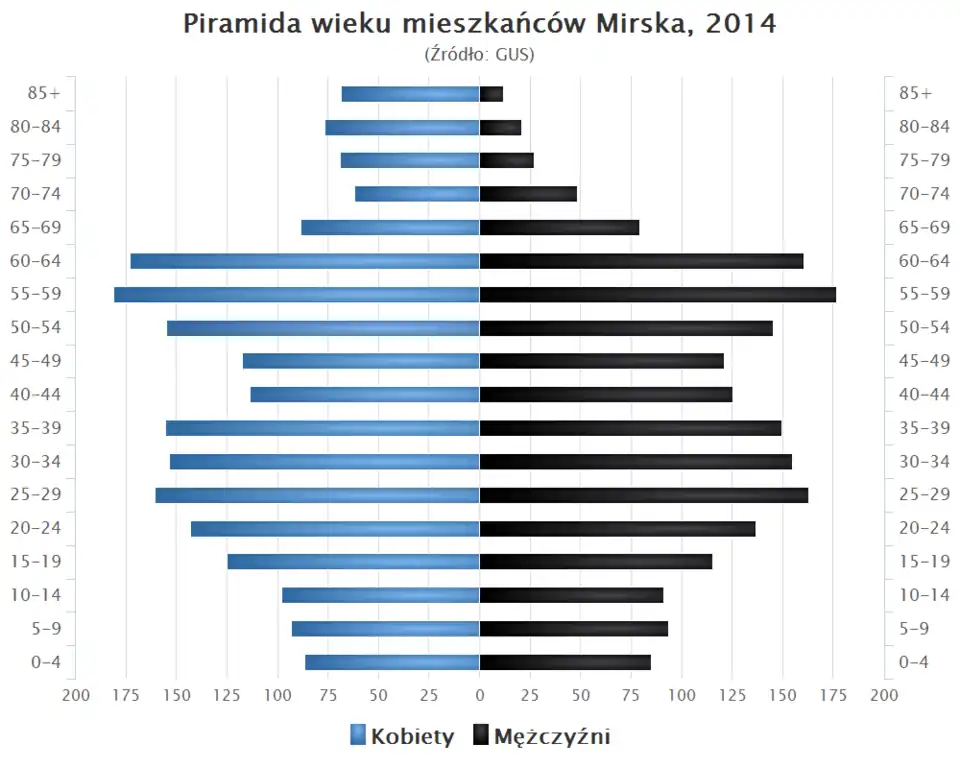 - Piramida wieku mieszkańców Mirska w 2014 roku[6].