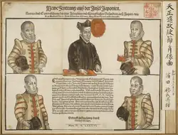 - ↑ Drugą próbą było poselstwo Tsunenagi Hasekury, który w 1613 roku wyprawił się do Europy jako pierwszy japoński ambasador.