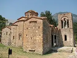 Klasztor został założony w 1310 roku. Jednokopułowy, częściowo wykuty w skale kościół zdobi najlepiej zachowany cykl fresków w Mistrze. Malowidła pochodzą w większości z XIV wieku. We wnętrze kopuły znajduje się przedstawienie Chrystusa Pantokratora w otoczeniu Marii i proroków, których postacie różnią się wielkością w zależności od ich rangi. W apsydzie znajduje się wizerunek Matki Boskiej. Górną część murów obiega cykl fresków ilustrujących sceny z życia Chrystusa m.in. Narodzenie Chrystusa, Chrzest, Przemienienie i Wjazd do Jerozolimy. Wizerunki proroków i świętych przedstawione zostały niżej, w takiej odległości od ołtarza, jaką dyktuje znaczenie danej postaci. Nad wejście znajdują się malowidła przedstawiające Niewiernego Tomasza i Zesłanie Ducha Świętego.
