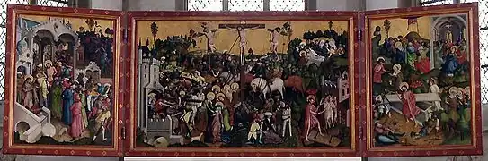 Centralna część ołtarza przedstawia Ukrzyżowanie wraz z czterema scenami Męki Pańskiej u dołu obrazu: Drogą krzyżową, Rozdzieleniem szat, Złożeniem do grobu i Chrystusa schodzący do otchłani przez bramę piekielną. Na zewnętrznych skrzydłach znajduje się osiem scen pasyjnych wkomponowanych w krajobraz.