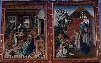 Po zamknięciu ołtarza ukazują się dwa obrazy: Zwiastowanie i Boże Narodzenie. Pierwszy kompozycyjnie i stylowo podobny jest do dzieła Campina, Ołtarza św. Barbary. Drugi obraz jest już oryginalną kompozycją Mistrza Ołtarza z Schöppingen. Dzieciątko Jezus leży nagie na podłodze odkrytej stodoły, przy nim klęczą trzej aniołowie, a nad nim chór aniołów głosi jego narodzenie. W tle widoczny jest krajobraz z widokiem na miasto oddany z dbałością o szczegóły[2][3].