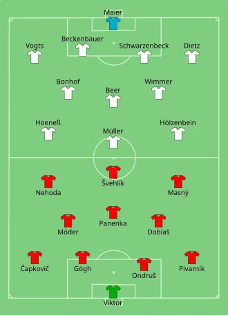 | 3:1 d.[6] | Anton Ondruš x1+1 sam, Zdeněk Nehoda, František Veselý | Półfinały | 4:2 d.[7] | Heinz Flohe, Dieter Müller x3 | ||