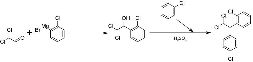 Synteza mitotanu jest dwuetapowym procesem. W pierwszym etapie otrzymywany jest 1-(2-chlorofenylo)-2,2-dichloroetanol, w wyniku kondensacji dichloroaldehydu octowego ze związkiem Grignarda – bromkiem (2-chlorofenylo)magnezu. Następnie związek ten reaguje z chlorobenzenem w obecności kwasu siarkowego dając mitotan[22].