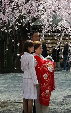 - 2. jest skróconą formą zwrotu hatsu-miya-mairi (jap. 初宮参り) związanego ze zwyczajem polegającym na zaniesieniu po raz pierwszy niemowlęcia do chramu i modlitwie o jego zdrowy rozwój. Zgodnie z tradycją dziecko trzyma na rękach babcia. Obrzędu tego dokonuje się 30 dni po narodzinach chłopca i 33 dni w przypadku dziewczynki[1].
