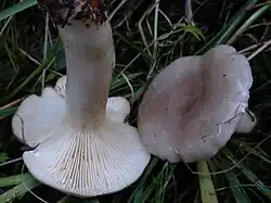 - mleczaj lśniący (Lactarius albocarneus). Jego mleczko żółknie, a skórka podczas wilgotnej pogody jest pokryta grubą warstwą śluzu[7]