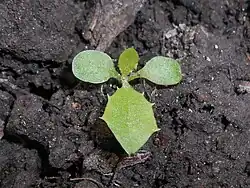 - Siewka ma nagi hipokotyl długości 1 cm. Dwa liścienie mają ogonki długości od 4 do 7 mm o nieco pochwiastej nasadzie. Naga blaszka liścieni jest jajowato-podługowata, do 1 cm długości, o nasadzie zbiegającej a szczycie ± wyciętym. Epikotylu brak. Pierwsze liście właściwe mają blaszkę eliptyczną o długości do 2 cm, o nasadzie zbiegającej a szczycie zaokrąglonym, na brzegu odlegle ząbkowaną, osadzoną na ogonku do 3 cm długości[36].