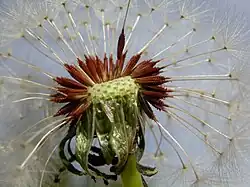 - Po zapyleniu, szypuły kwiatostanowe na czas dojrzewania nasion pokładają się nieco, unikając zgryzienia lub skoszenia, po czym po dojrzeniu nasion prostują się i wydłużają, co ułatwia dyspersję nasion. Od kwitnienia do rozwoju dojrzałych owoców mija 7 dni[26]. Nasiona roznoszone są przez wiatr na duże odległości (anemochoria). Dodatkowo przystosowaniem do wiatrosiewności, poza wyeksponowaniem nasion, jest także wytwarzanie niewielkich i lekkich owoców zaopatrzonych w aparat lotny w postaci licznych włosków powstałych w wyniku modyfikacji kielicha. Aparat włoskowy działa jak aparat spadochronowo-lotny, znacznie zmniejszając tempo spadania owocu, wynoszące w efekcie 0,33 m/s[32]. W rezultacie znaczna część diaspor mniszka przelatuje na odległość 200–500 m od rośliny macierzystej[26] (według niektórych źródeł średni dystans to nawet 10,2 km[32]). Przemieszczanie w powietrzu ułatwia tworzenie się wiru powietrznego (obszaru niskiego ciśnienia) nad aparatem lotnym zasysającego owoc. Kluczowym czynnikiem umożliwiającym powstawanie siły nośnej jest kolisty obrys aparatu lotnego i jego porowatość – siła nośna nie powstałaby, gdyby włoski były luźniejsze lub bardziej gęste[33]. Nasiona mogą być także transportowane wodą, w której bez szkody mogą spędzić do 9 miesięcy[26]. Z jednego kwiatostanu powstać może około 150 owoców[34].