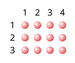 gdzie liczby 3 i 4 są czynnikami, a 12 to ich iloczyn. Powyższe oznacza, że trzy grupy po cztery elementy to razem dwanaście elementów. Z każdej z powyższych równolicznych grup można wybrać kolejno po jednym elemencie i w ten sposób stworzyć cztery nowe grupy zawierające po trzy elementy: