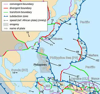Mobilna strefa Filipin od północy i wschodu graniczy z płytą filipińską, a od południa i zachodu z płytą sundajską.