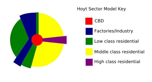 Brak uwzględnienia odchyleń w poszczególnych strefach Hoyt uznał za błąd Burgessa i zaproponował sektorowy model miasta. Założył, że miasta rozwijają się w formie sektorów, których przebieg opiera się na układzie promienistym. Strefy te są zróżnicowane funkcjonalnie. W tym ujęciu zakłady przemysłowe lokowane są w miejscach dogodnego transportu kolejowego lub kołowego. Ciągi komunikacyjne traktowane są jako główny czynnik miastotwórczy. Ponadto wewnątrz sektorów następują zmiany intensywności użytkowania, przy czym teren najintensywniej użytkowany znajduje się w pobliżu centrum. Dzielnice klasy robotniczej nie zajmują już terenu otaczającego centrum z uwagi na wysokie koszty, znajdują się tam mieszkania o wysokim standardzie.
