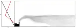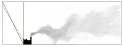 Przedstawiono sytuację w otoczeniu dwóch emitorów. Początkowe stężenie zanieczyszczenia jest równe zero (niebieskie tło). Po włączeniu pierwszego emitora można zaobserwować zmianę kształtu smugi zanieczyszczeń (pole pomarańczowe o nasyceniu barwy skorelowanym ze stężeniem zanieczyszczenia); ta zmiana jest spowodowana przez wysoki budynek, znajdujący się na drodze strugi. Opisując przykładową sytuację założono, że drugi emitor jest włączany po pewnym czasie, a równocześnie ulega zmianie kierunek wiatru (z zachodniego na południowo-zachodni)[5][6].
