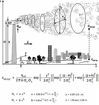 Smuga zanieczyszczeń jest obiektem trudnym do modelowania. Jej kształt zależy od wielu czynników topograficznych i meteorologicznych. Stosowany jest model bardzo uproszczony – różniczkowe równanie Pasquille’a, które opisuje zależność stężenia zanieczyszczeń w punkcie P(x,y,z) smugi cod,xyz [ouE/m³] od: